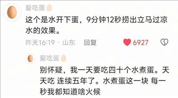 有网友追问溏心蛋怎么做,他秒回7分11秒;有人煮蛋翻车,他一眼看穿“水没淹过蛋”。为了回应网友们的诸多问题,博主“爱吃蛋”连夜录制了一条煮蛋视频,完整直观地让网友们看到了不同时长的水煮蛋呈现出的不同效果。