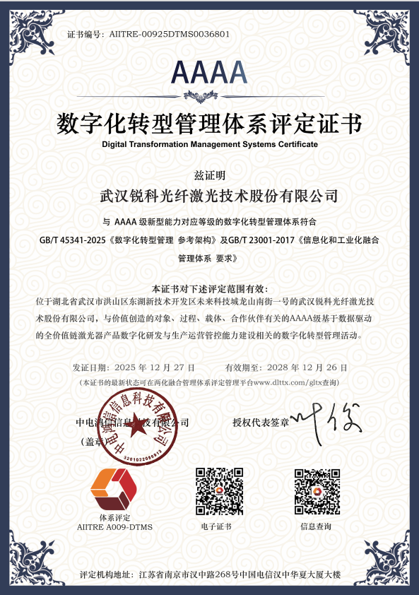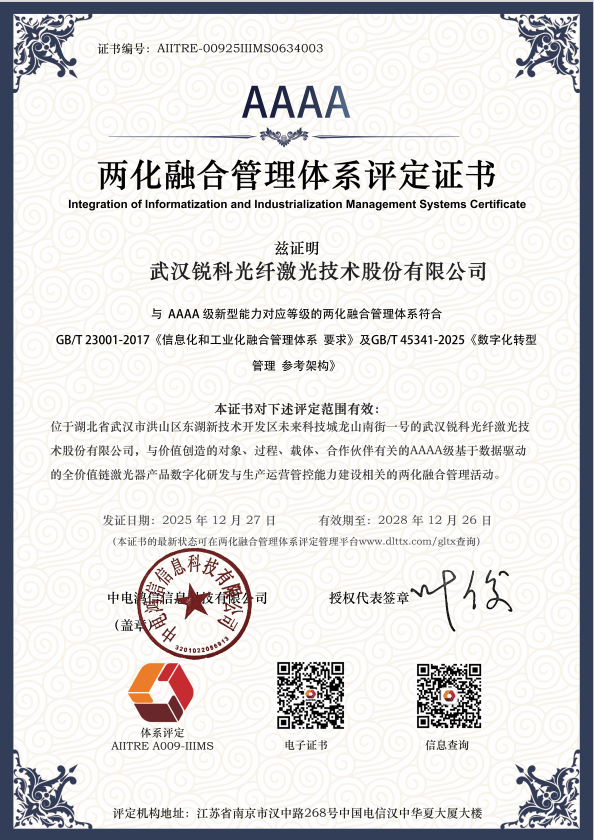 12月27日,锐科激光(300747)凭借在数字化建设领域的深耕实践,荣获“AAAA级数字化转型管理体系”和“AAAA级两化融合管理体系”两项评定证书,标志着公司在全价值链数字化建设领域的核心能力和信息化与工业化深度融合方面获得国家层面双重认可,树立了激光行业高质量发展的新标杆。